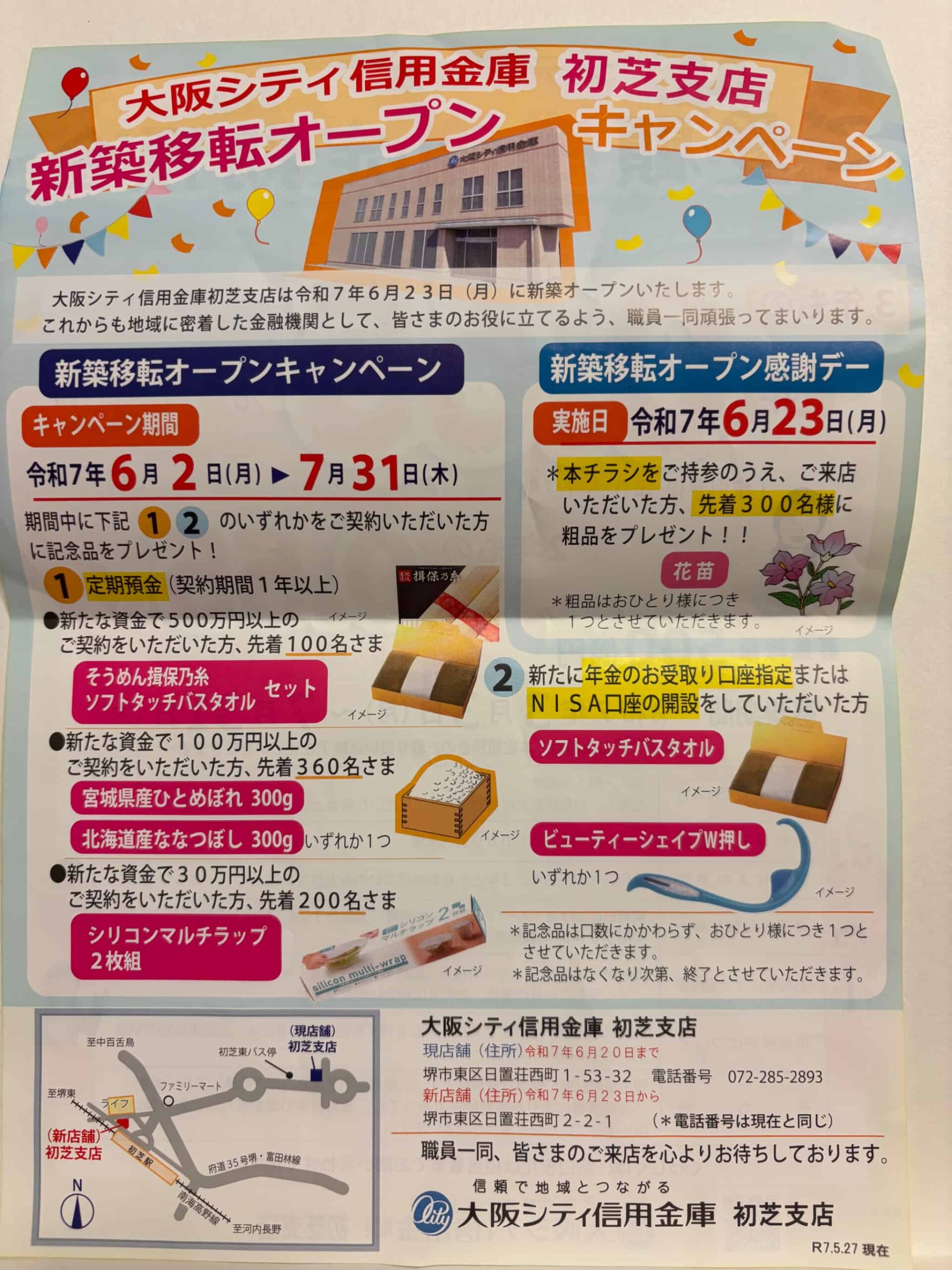 堺市東区・初芝駅近くに『大阪シティ信用金庫・初芝支店』が6月23日(月)に新築移転オープンしますよ! 新店舗は初芝駅の近くでとても便利になりますね!新築移転オー […]