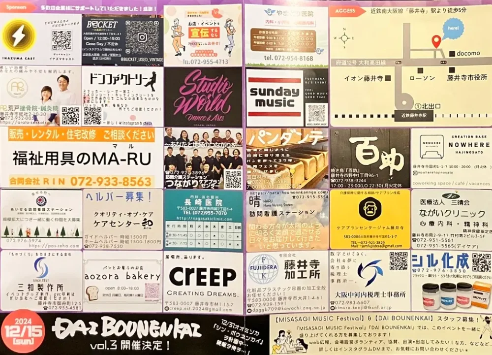 昨年末に藤井寺で開催され大盛り上がりだった、音楽フェスDAIBOUNENKAI。その流れを汲む音楽フェス『美陵音祭(MISASAGI Music Festival)』が9/29(日)に再びパープルホール(藤井寺市立市民総合会館)で開催されます!!