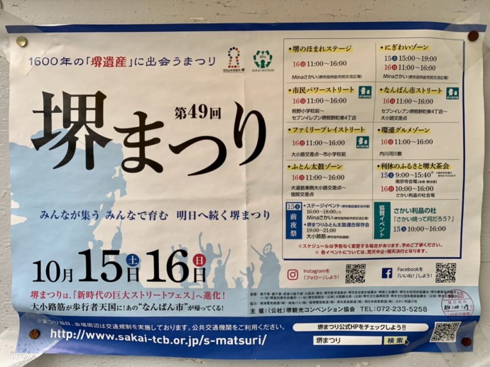 1600年の「堺遺産」に出会うまつり『第49回 堺まつり』が開催されます! 今年の堺まつりは大小路筋が歩行者天国になるようです!! 各会場のスケジュールをチェッ … 続きを読む 【イベント】2022.10/15(土)・10/16(日)開催★今年は大小路筋が歩行者天国に!新時代の巨大ストリートフェス『第49回 堺まつり』を遊びつくそう♪: