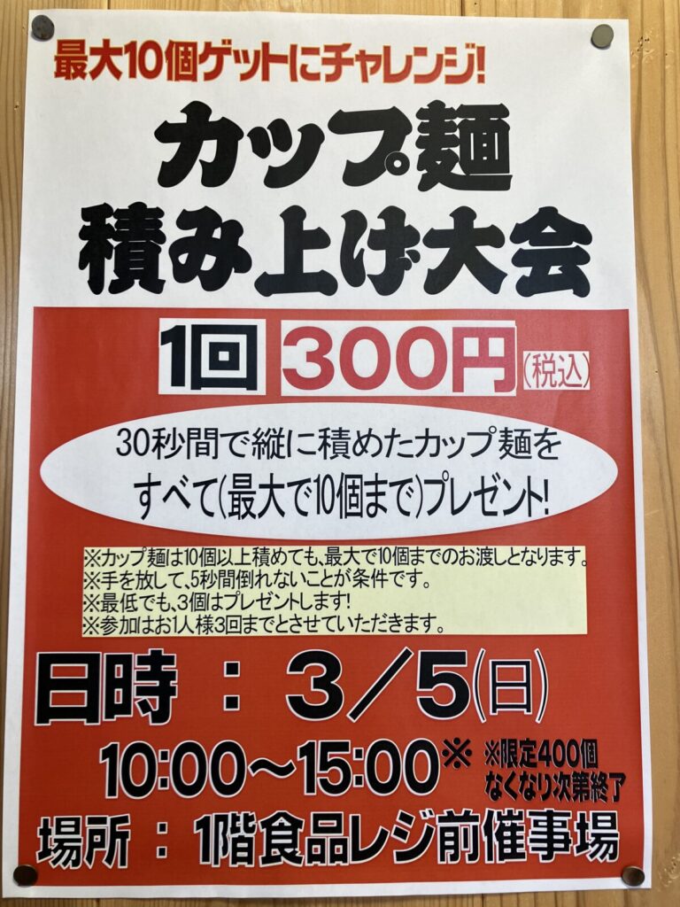 イズミヤ河内長野店の1階食品レジ前催事場にて『カップ麺積み上げ大会』が3/5(日)に開催されますよ~!!
