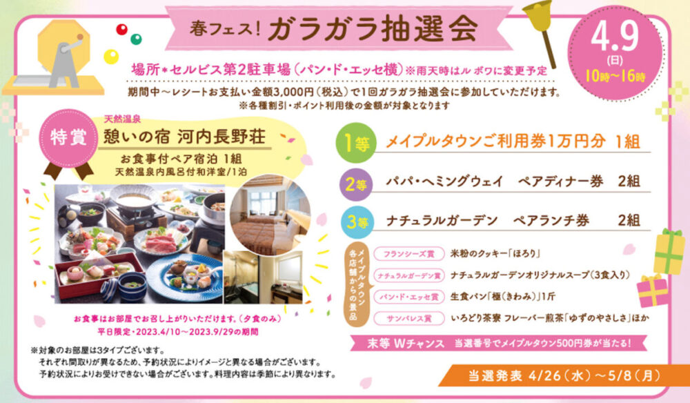 【お忘れなく】ガラガラ抽選会は4月9日!メイプルタウンのさくら祭: