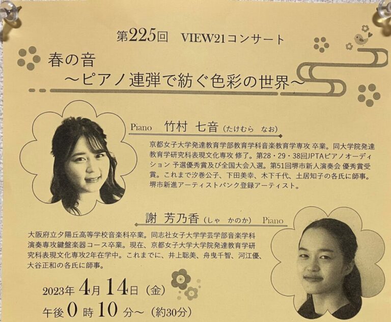堺市役所展望ロビーで『春の音~ピアノ連弾で紡ぐ色彩の世界~』ピアノコンサンサートが行われます。