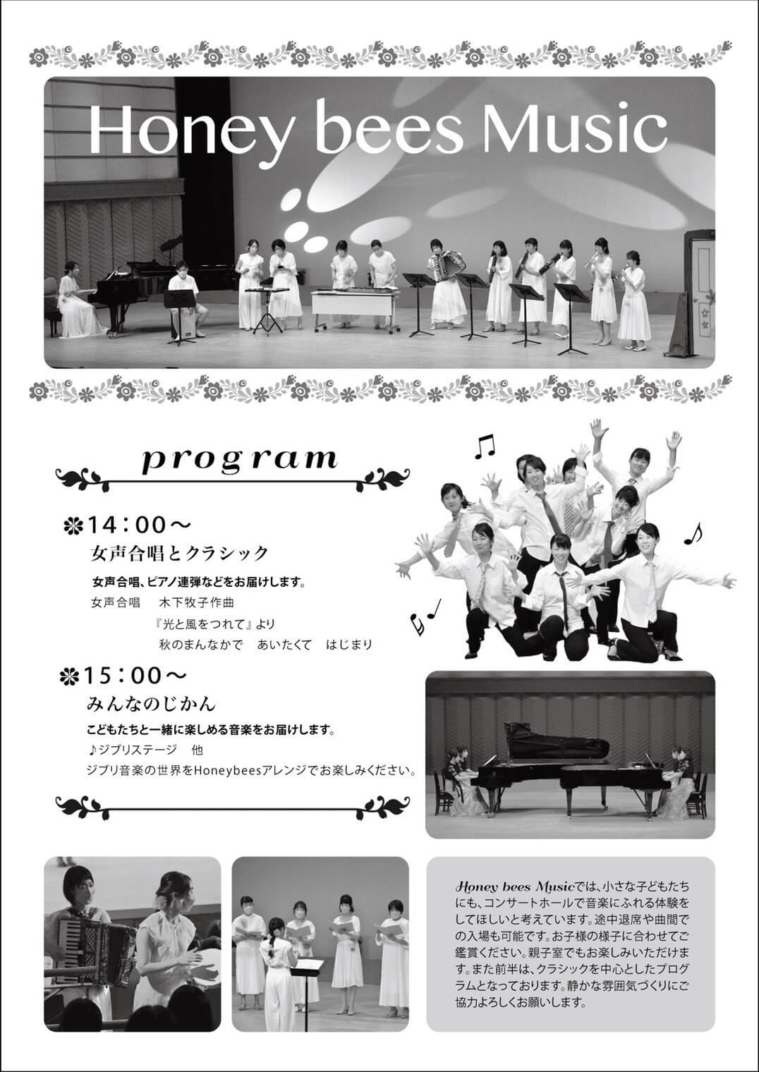 [プログラム]1部 14:00~ 女声合唱とクラシック、2部 15:00~ みんなのじかん