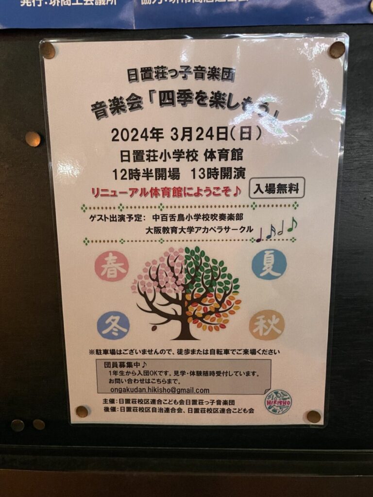 2024年3月24日(日)、日置荘っ子音楽団による音楽会「四季を楽しもう」が日置荘小学校・体育館にて開催されます!