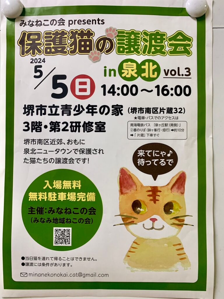 堺市南区・堺市立青少年の家で主に泉北ニュータウンで保護された猫たちの譲渡会『保護猫の譲渡会』が開催されます♪