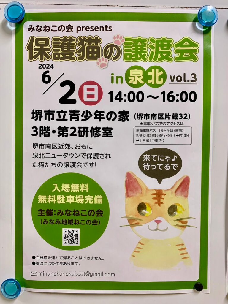 堺市南区・堺市立青少年の家で主に泉北ニュータウンで保護された猫たちの譲渡会『保護猫の譲渡会』が開催されます♪