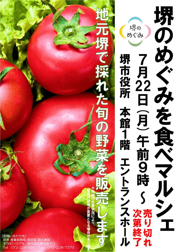 7/22(月)堺市役所で「堺のめぐみ」を食べマルシェ!が開催されます。