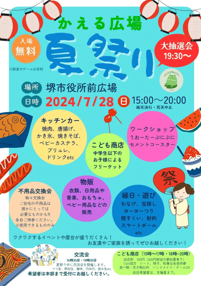 7月28日(日)、堺東駅近くの堺市役所前広場にて、『かえる広場 夏祭り』が開催されます♪