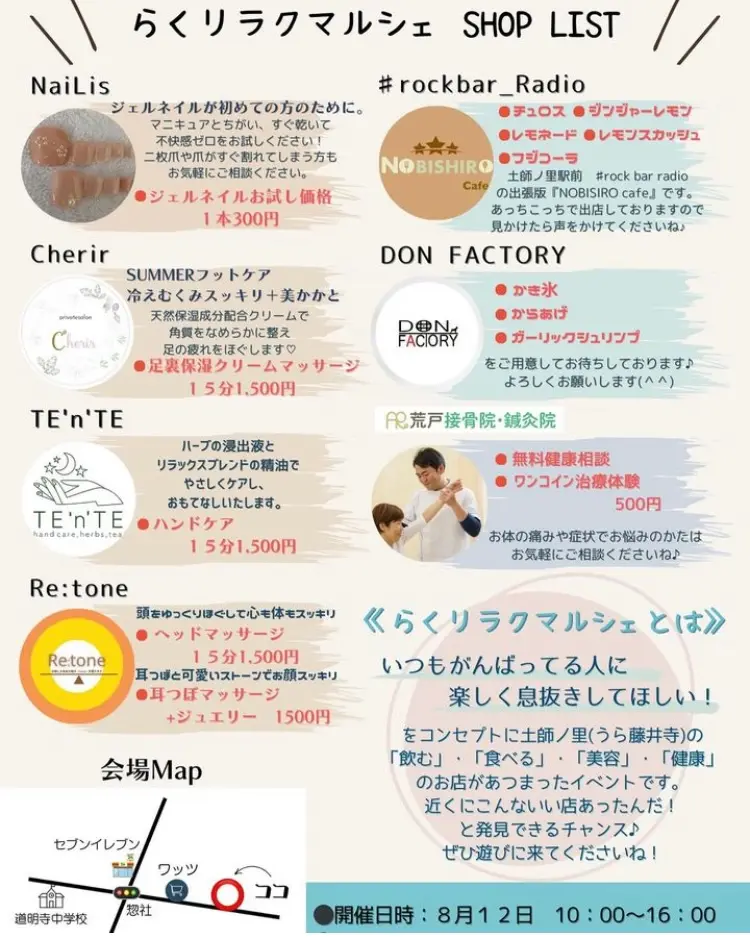 8月12日(月・祝)に藤井寺市にある荒戸接骨院・鍼灸院で『らくリラクマルシェ』が開催されます。「いつもがんばってる人に楽しく息抜きしてほしい!」をコンセプトに初開催!