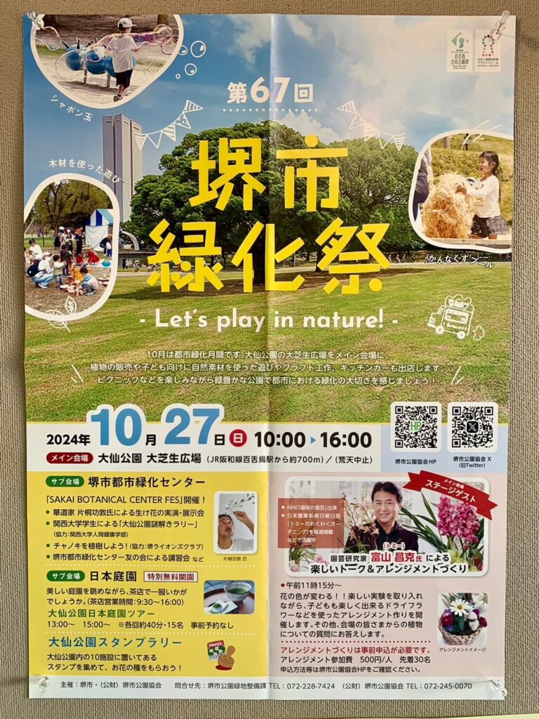 大仙公園では、植物の販売や子ども向けに自然素材を使った遊びやクラフト工作やキッチンカーも出店される『堺市緑化祭』が開催されますよ♪