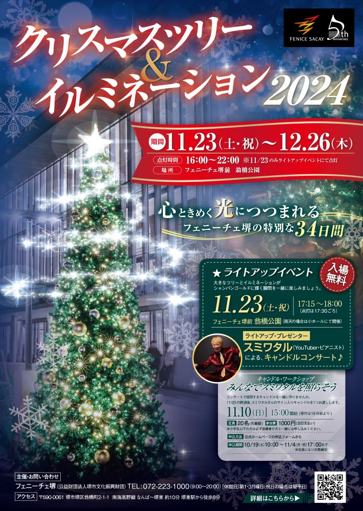 堺市堺区、南海高野線「堺東」駅から歩いて8分ほどのところにある、芸術文化ホール『フェニーチェ堺』では、この冬もクリスマスムード満載の『クリスマスツリー&イルミネーション2024』のライトアップイベントが11月23日(土・祝)に開催されますよ♪
