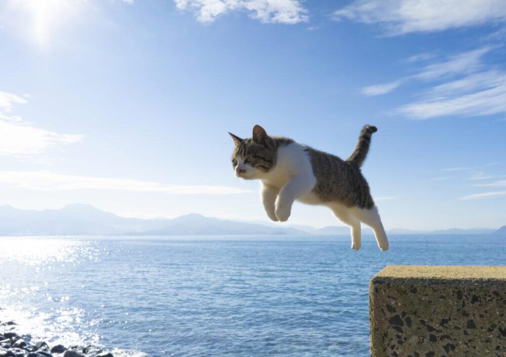 海と空のブルーを背景に、澄ました表情でぴょんと飛ぶ猫の姿がとっても愛らしいですね♡