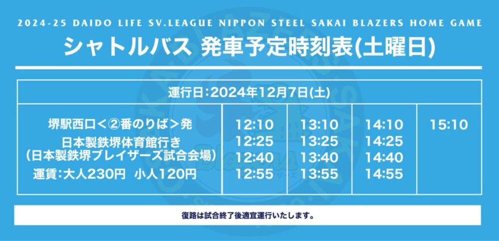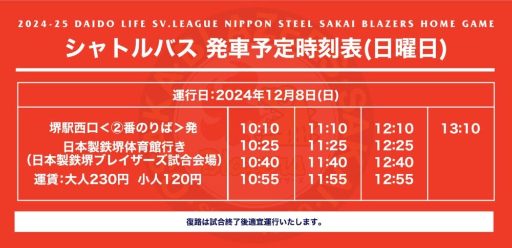 日本製鉄堺体育館行き(日本製鉄堺ブレイザーズ試合会場)