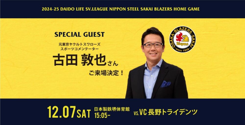 12/7(土)の試合では、元ヤクルトスワローズでスポーツコメンテーターの古田敦也さんもご来場し、一緒に試合を盛り上げてくださいますよ~!!