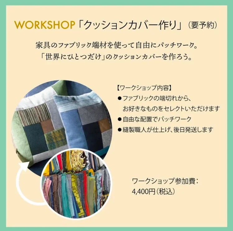 おすすめは、ファブリックの切れ端から好きな生地で選んで、世界で一つの「クッションカバー作り」。家具メーカーの縫製職人さんが仕上げてくれて、このお値段はびっくりです!(要予約)