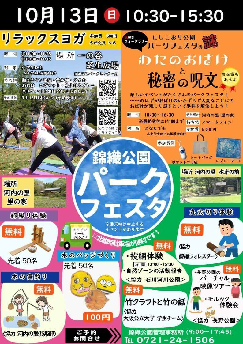 10月13日(日) 10時30分〜15時に、大阪府営錦織公園で秋のパークフェスタが開催されますよ~!!