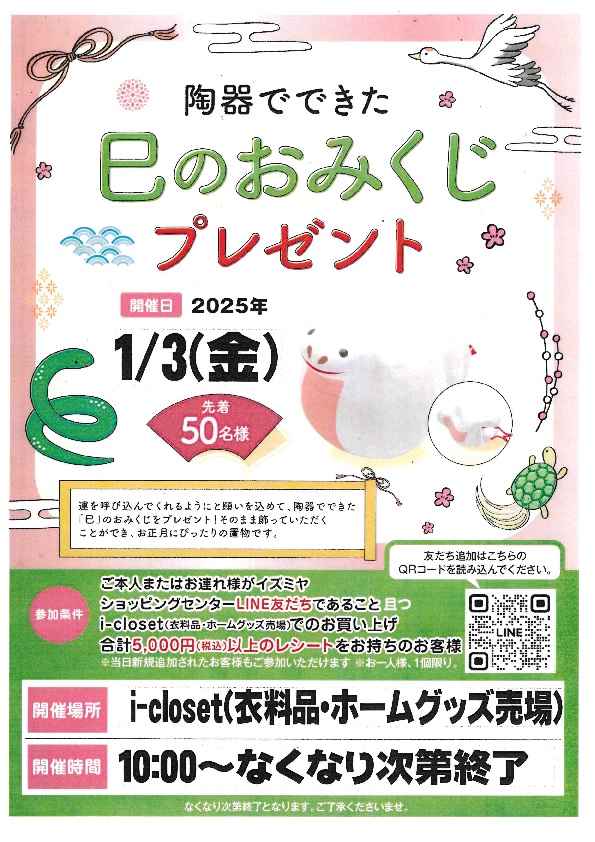 イズミヤショッピングセンタ-古市にてイズミヤで新春イベント開催!巳のおみくじプレゼント&期間限定和菓子販売します!