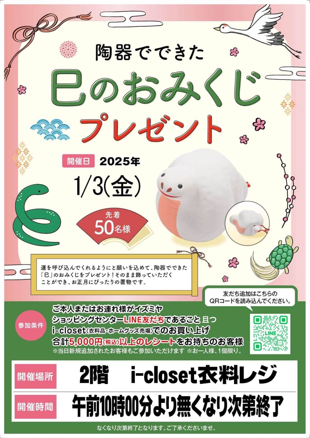1/3(金) 2階i-closet売場「陶器でできた巳のおみくじプレゼント」