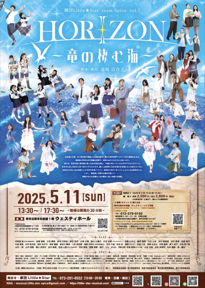 2025年5月11日(日)に堺市西区、堺市立西文化会館ウェスティホール1階で「ジュニアミュージカル劇団Little★ Star – team Spica‐」による第7回公演「HORIZON~竜の棲む海~」が上演されますよ!