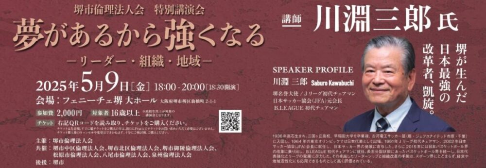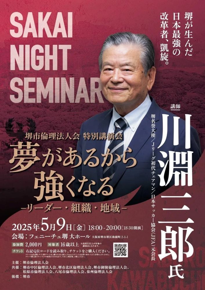 三国丘高校卒業生、堺名誉大使でもある川淵氏から、次世代につなぐ熱い想いを直接聴ける貴重な機会です。ぜひお誘い合わせの上ご参加ください!
