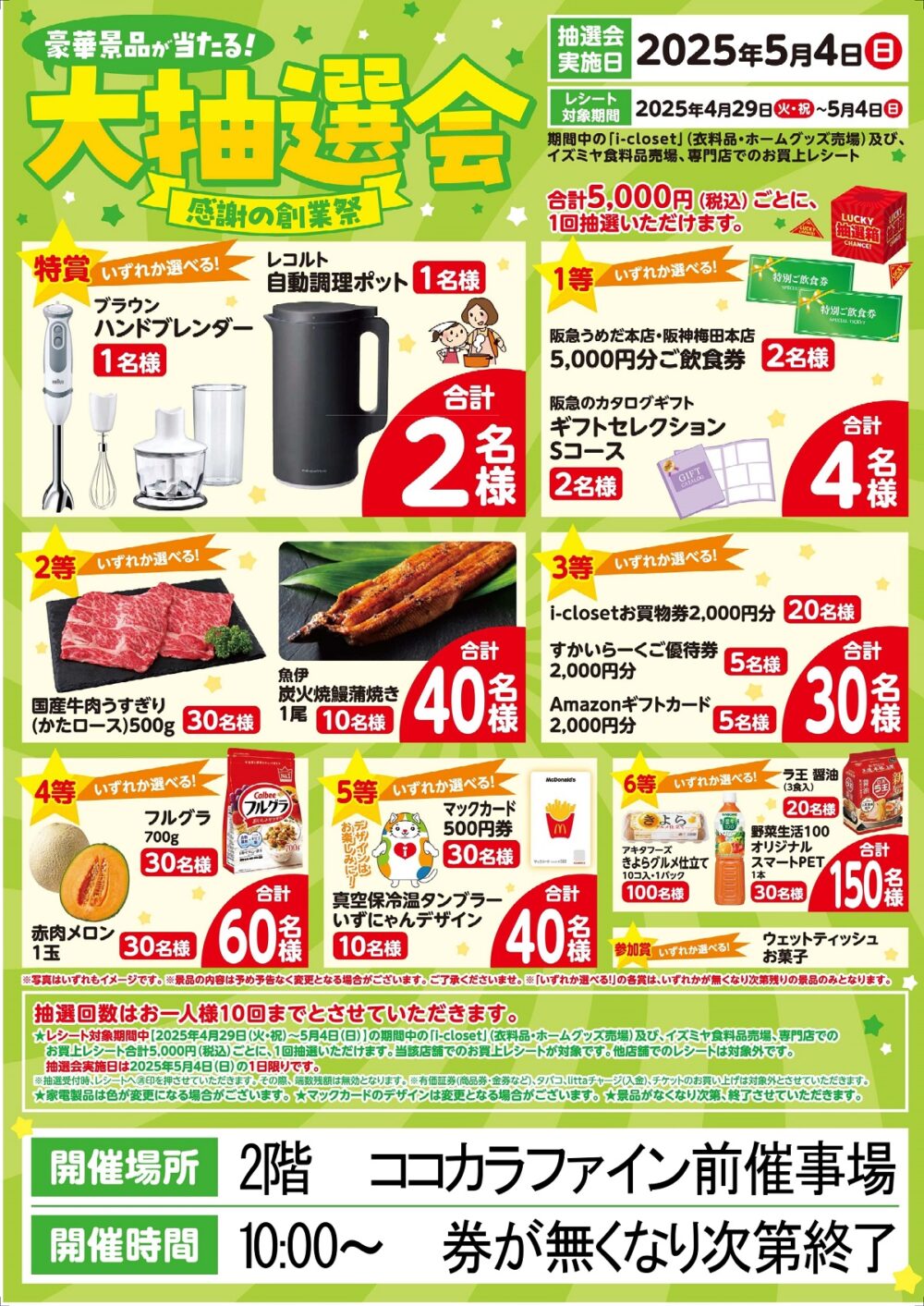 期間中の「i-closet」(衣料品・ホームグッズ売場)及び、イズミヤ食料品売場、対象テナントでのお買上レシート合計5,000円(税込)ごとに、1回抽選いただけます。