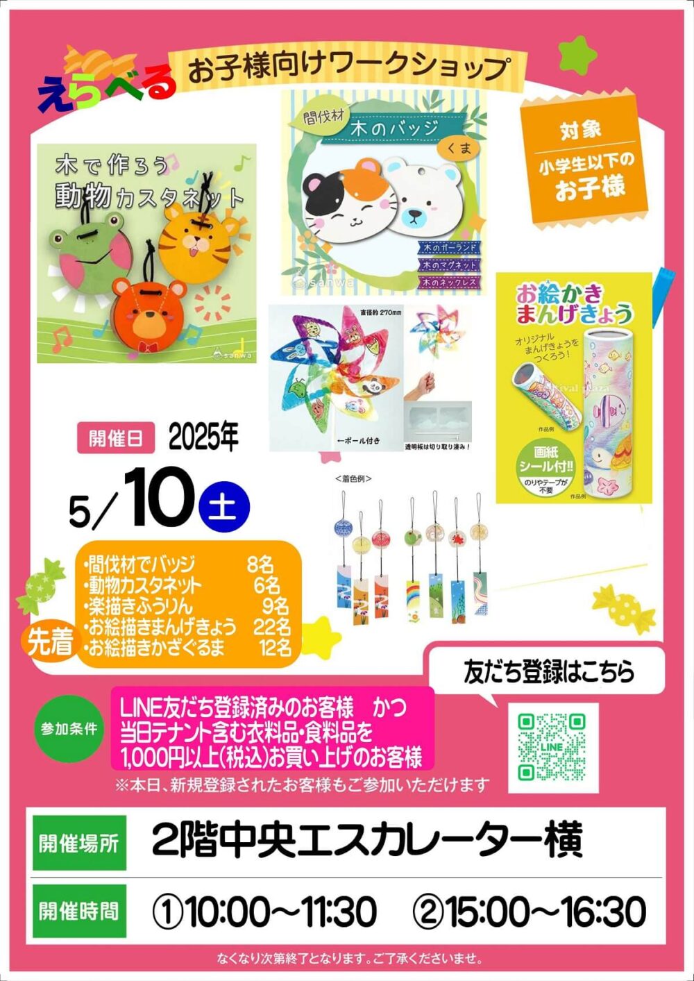 参加条件:LINE友だち登録済みのお客様かつ、当日テナント含む衣料品・食料品を1,000円以上(税込)お買上げのお客様