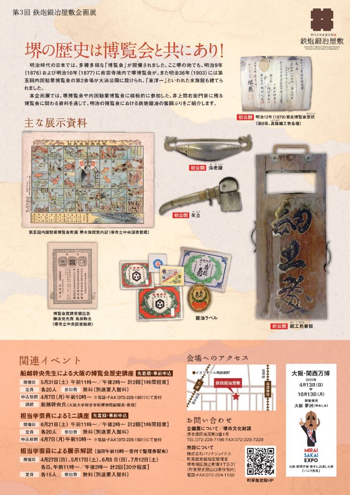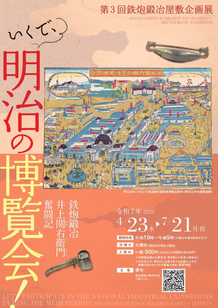 2025 年大阪・関西万博に合わせて、鉄炮鍛冶屋敷(町家歴史館井上関右衛門家住宅)で第3回企画展「いくで、明治の博覧会!-鉄炮鍛冶井上関右衛門奮闘記-」を開催します。