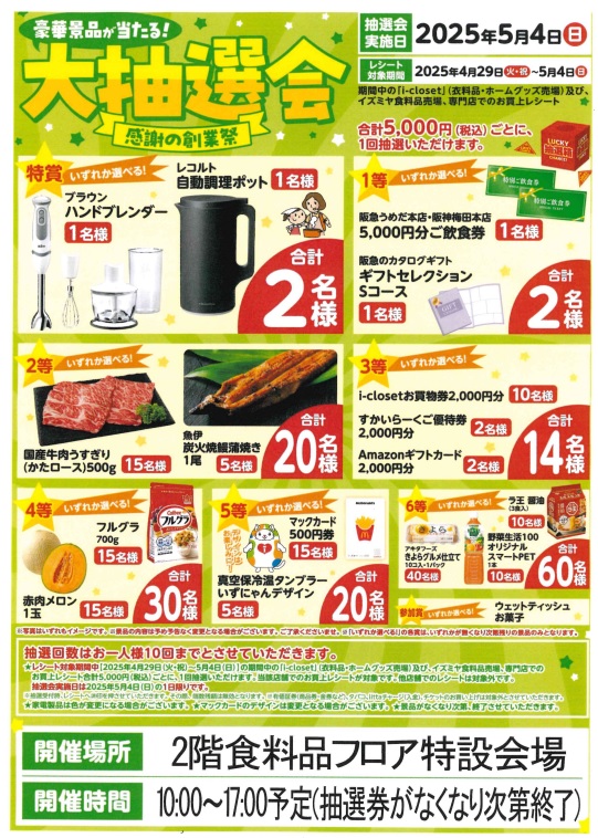 イズミヤ食料品売場、専門店でのお買上レシ-ト合計5,000円(税込)ごとに1回抽選いただけます。