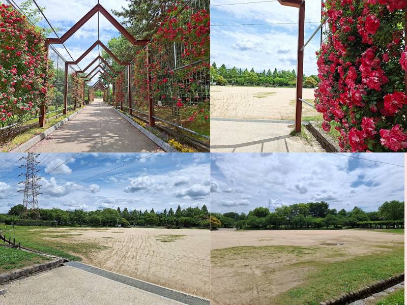 満開のバラが綺麗なアーケードの先「催し広場」と、「大芝生広場」が会場です。