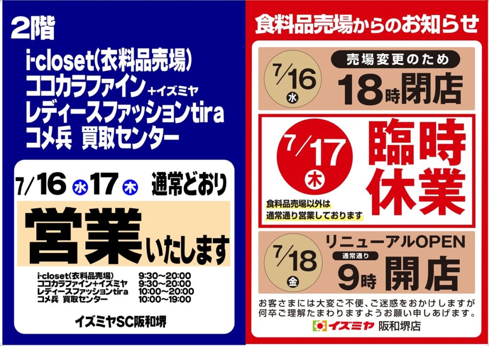 ※2階「i-closet」、ココカラファイン+イズミヤ、レディースファッションティラ、コメ兵買取センターは2日間とも通常営業です。