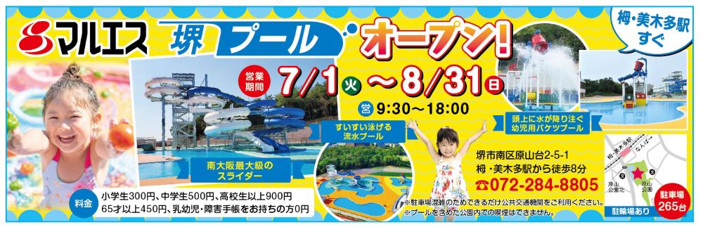 堺市南区・栂・美木多駅から徒歩約8分、原山公園内にある「マルエス堺プール」が、今年も夏季営業を開始しました!
