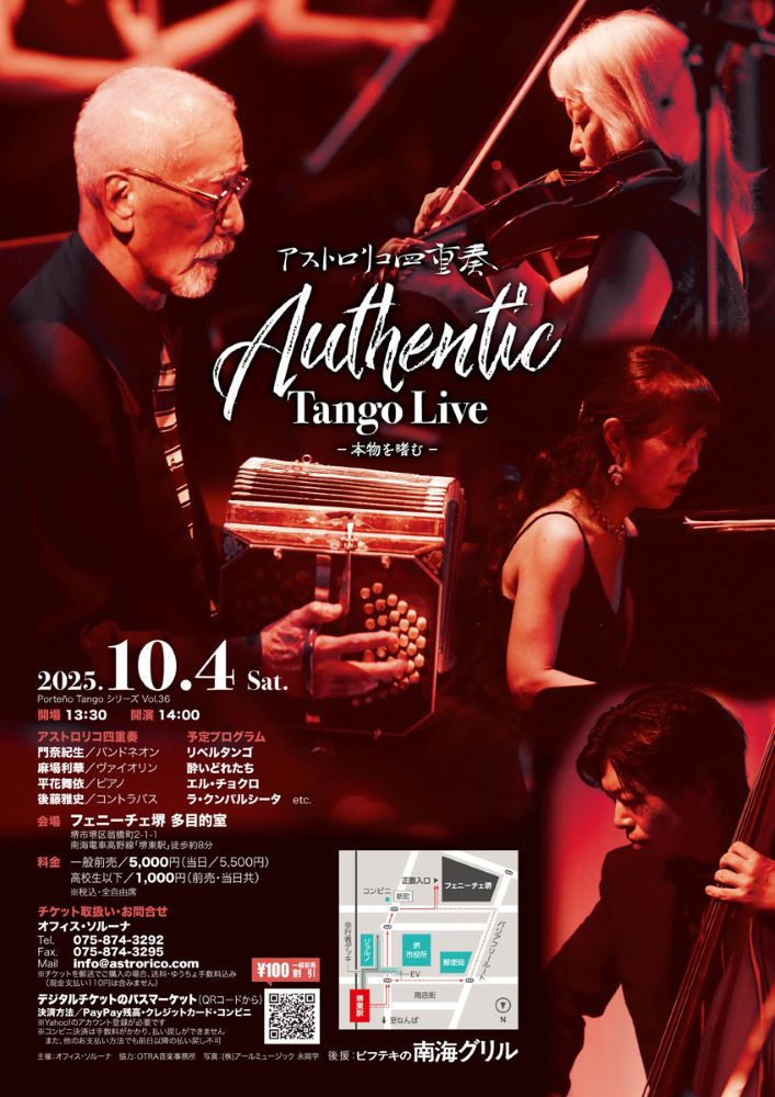 2025年10月4日(土)、堺市堺区にある『フェニーチェ堺』にて「アストロリコ四重奏 Authentic Tango Live~本物を嗜む~」が開催されます。