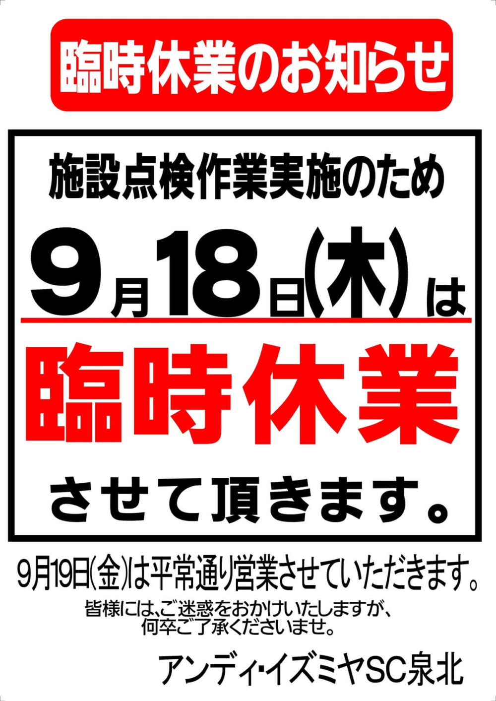 9月18日(木)は施設点検のため全館休業させていただきます。