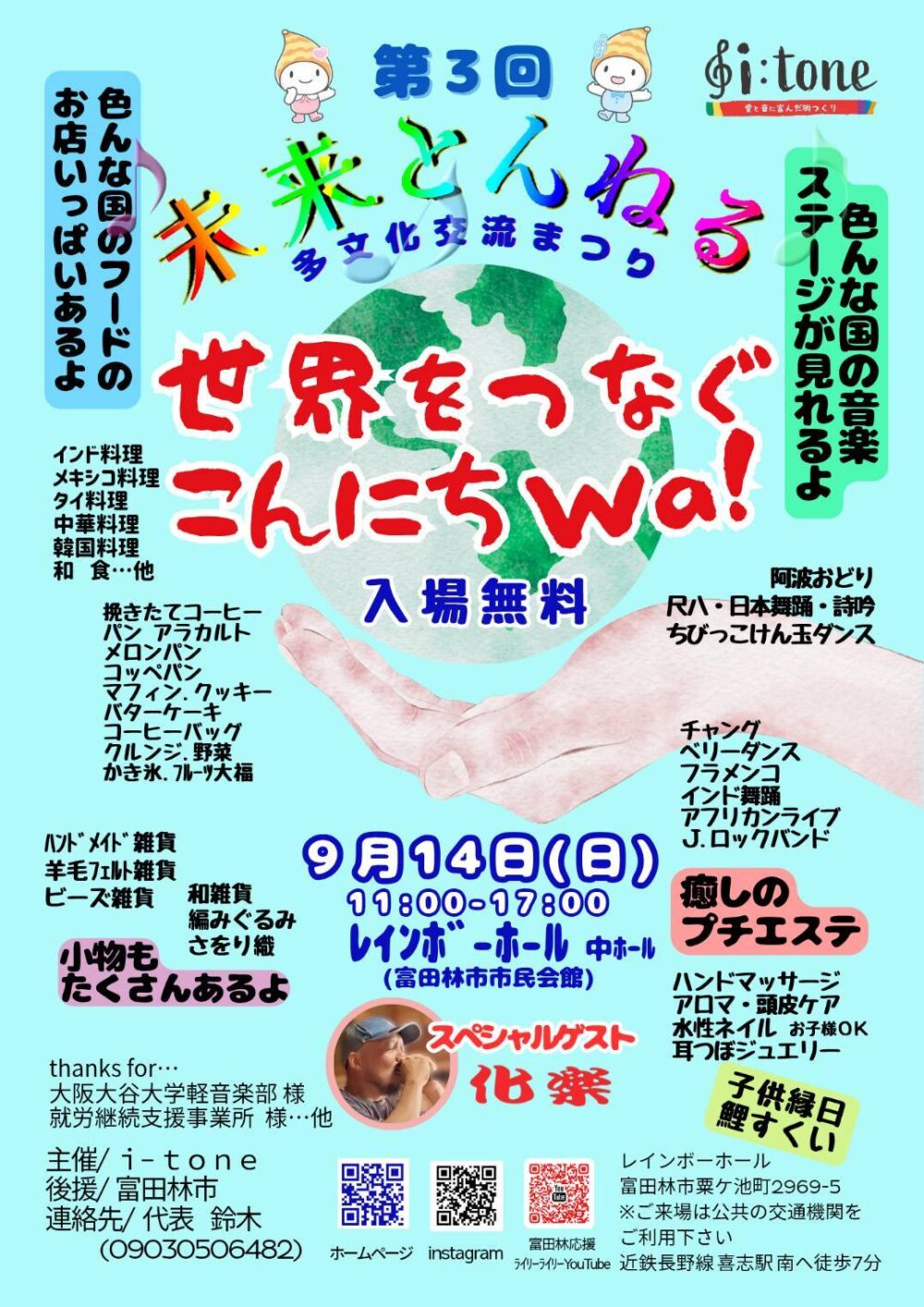 「i: tone」が主催する『第3回 未来とんねる』が、今年も富田林市立市民会館(レインボーホール)で開催決定!今年のテーマは、『世界をつなぐこんにちWA!』です。
