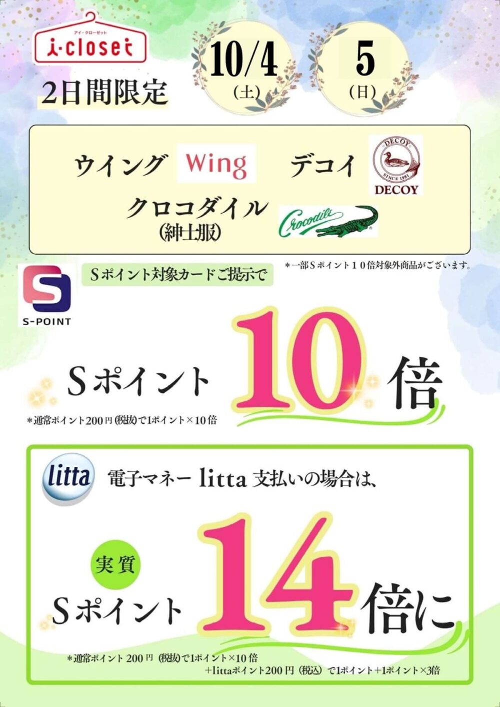 10月4日(土)・5日(日)の2日間限定で、衣料品売場の対象ブランド商品が、Sポイント10倍の対象となります。