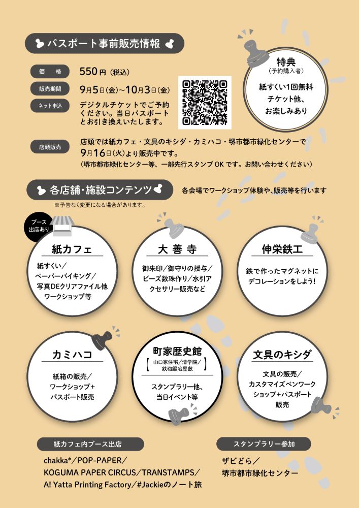 参加会場:文具のキシダ/大善寺/カミハコ/ザビどら/伸栄鉄工/町家歴史館(山口家住宅・清学院・鉄砲鍛治屋敷)/堺市都市緑化センター