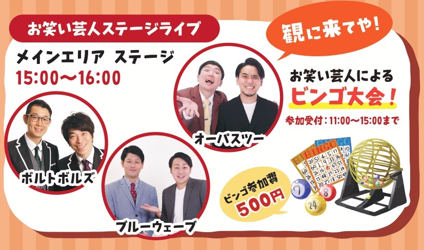 - ビンゴ大会:お笑い芸人によるビンゴ大会も開催!参加費 500円で豪華景品が当たるチャンス!(参加受付 11:00~15:00まで)