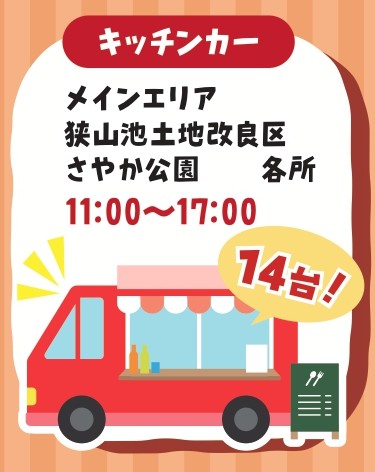 今回は、メインエリア、狭山池土地改良区、さやか公園各所に、14台のキッチンカーが出店します。