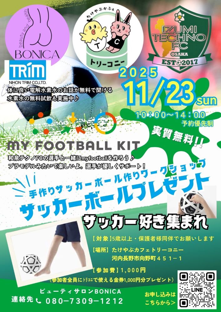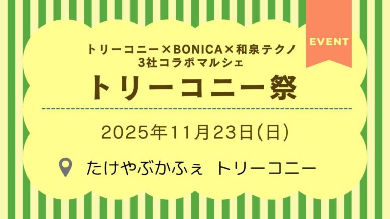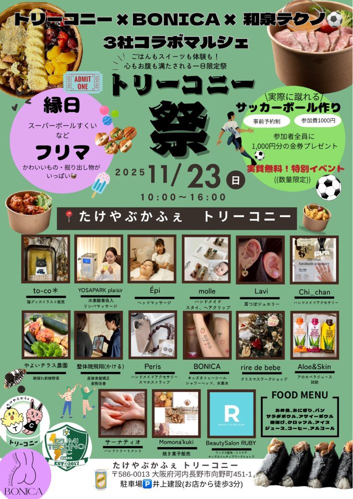 カフェの「たけやぶかふぇトリーコニー」、美容の「ビューティーサロンBONICA」、そしてサッカーチームの「和泉テクノ」という、3社がタッグを組んだ「トリーコニー祭」は、食、美、スポーツを一度に楽しめる、地域密着型のマルシェです!