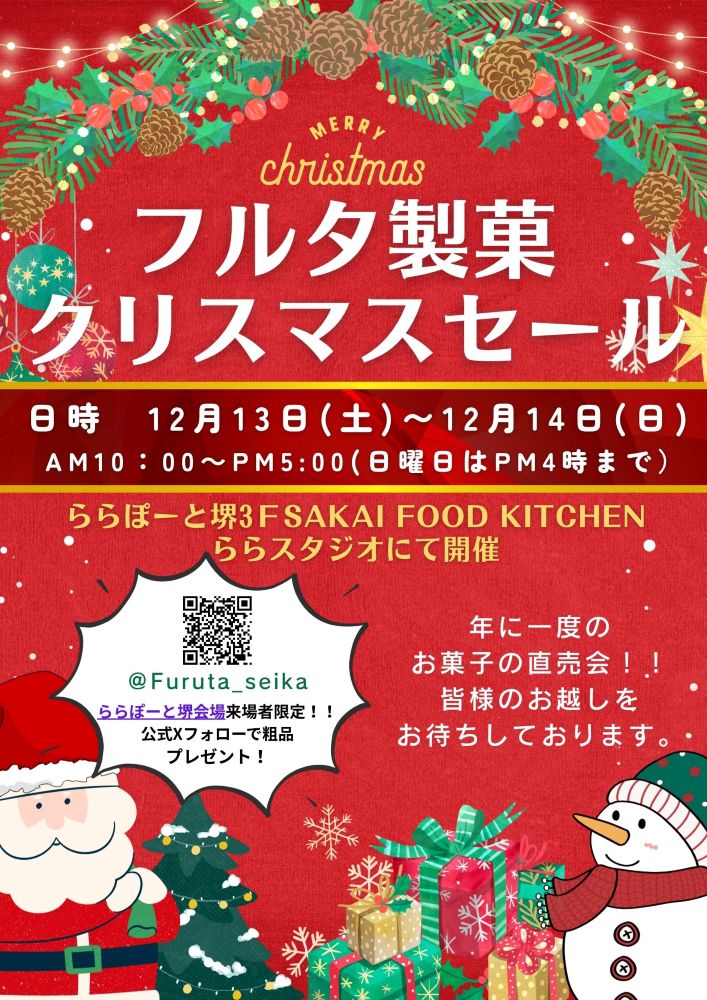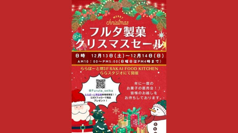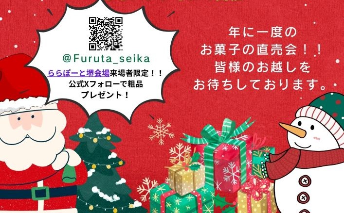 今回ご紹介するのは、お菓子好きにはたまらない年に一度のビッグチャンス!あの大手お菓子メーカー「フルタ製菓」が、ららぽーと堺で開催する、クリスマスセール(直売会)です!
