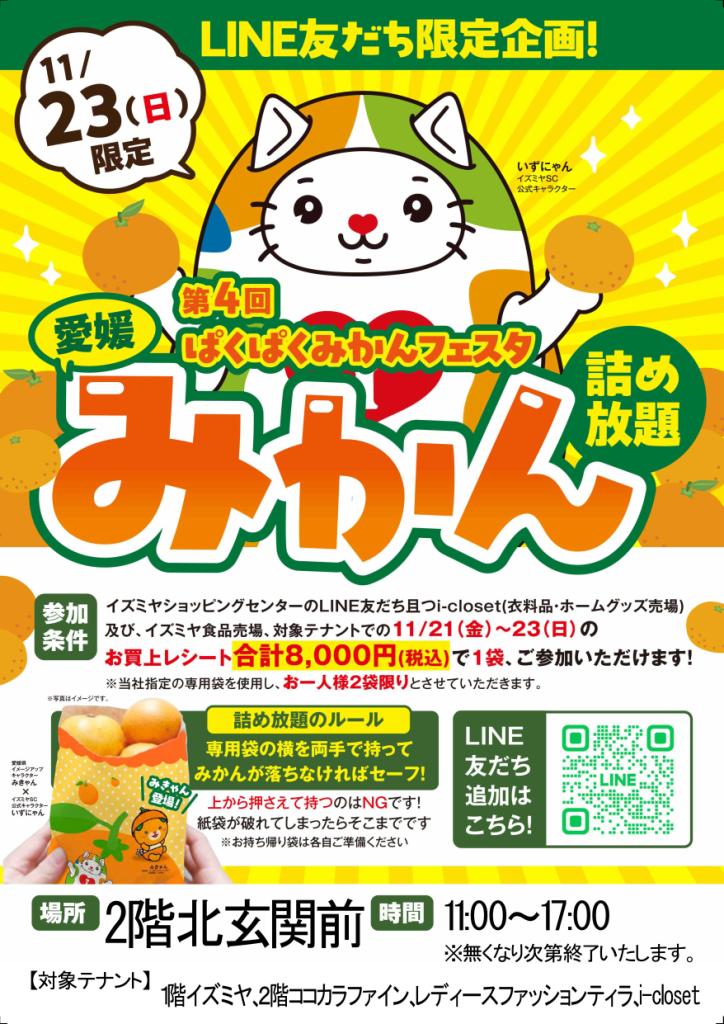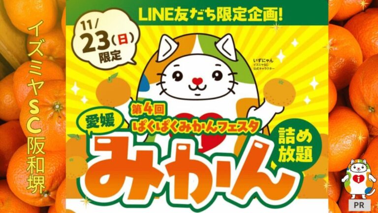 食欲の秋のクライマックス!11月のイズミヤSC阪和堺は、お客様への感謝を込めた大盤振る舞いイベントが目白押しです!毎年大好評の「みかん詰め放題」をはじめ、人気のシフォンケーキの限定販売、さらに心温まるハンドメイド作品に出会えるまるしぇまで開催。お買い物がお得で楽しくなるこの機会を、どうぞお見逃しなく!