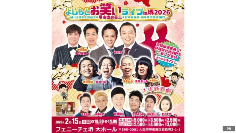 お笑いファン待望の超豪華ライブ「よしもとお笑いライブ in 堺2026 〜M-1王者&人気芸人&堺市出身芸人&吉本新喜劇 超豪華大集合SP!〜」が、2026年2月15日(日)にフェニーチェ堺 大ホールで開催されます!