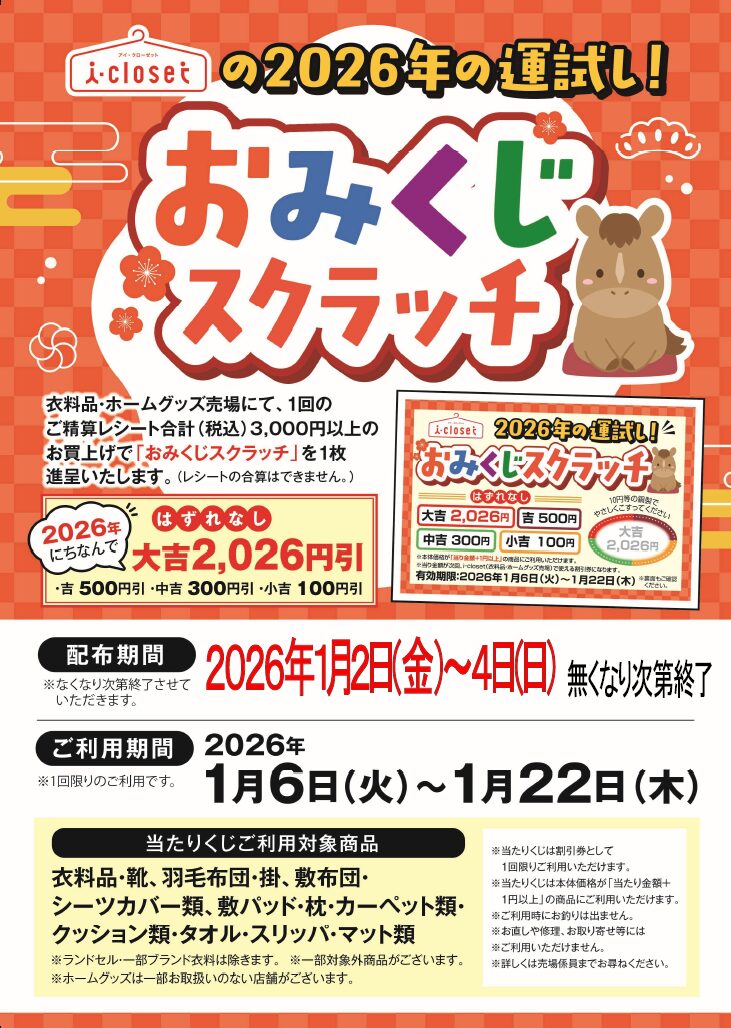 1/2(金)からの初売りには衣料品・ホームグッズi-closet(アイ・クローゼット)へお越しください!