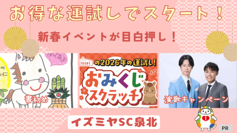 1月のイズミヤSC泉北は、新春ならではの「書き初め大会」や、ドキドキの「おみくじスクラッチ」、そして心躍る「演歌キャンペーン」など、お正月気分を盛り上げる楽しいイベントが満載です! まずは気になる年末年始の営業時間と、1月の注目トピックをまとめてチェックしていきましょう!