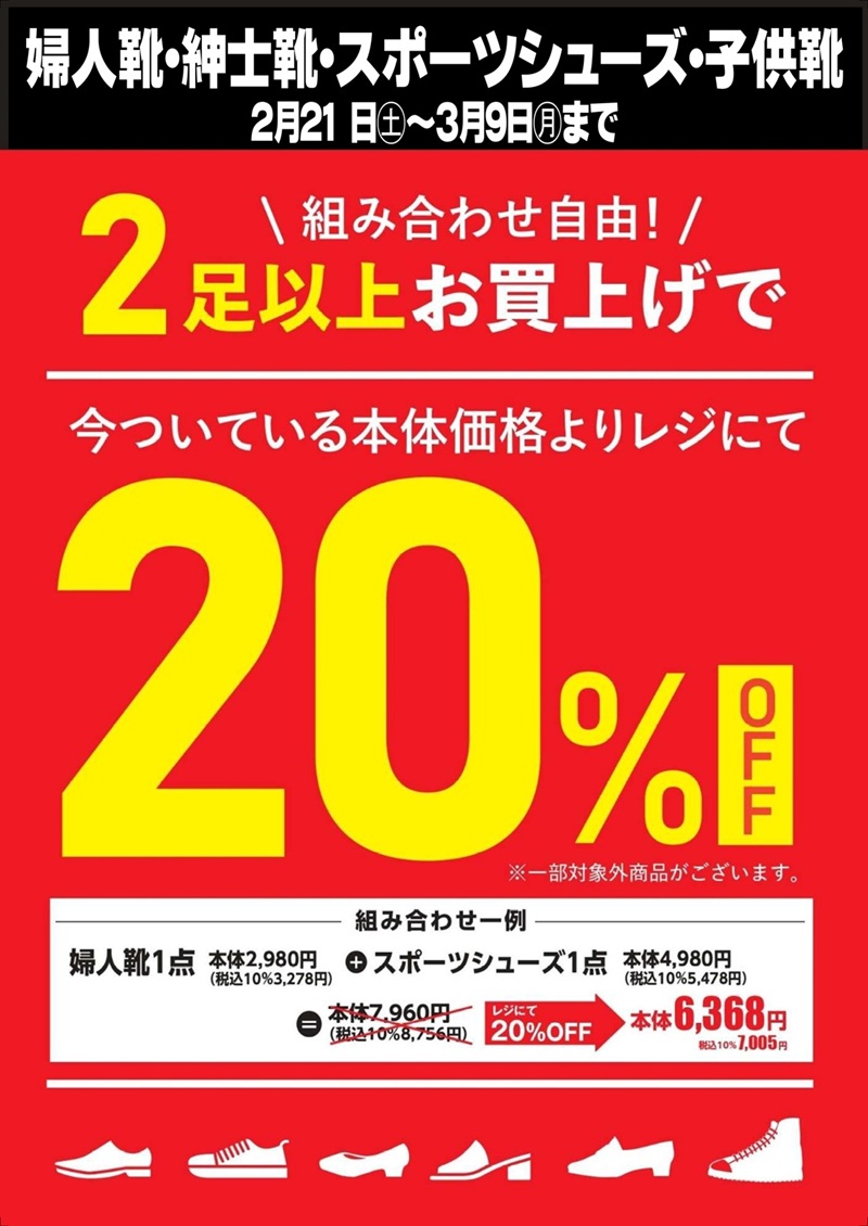 靴2足以上の購入でレジにて20%OFF(一部対象外商品あり)