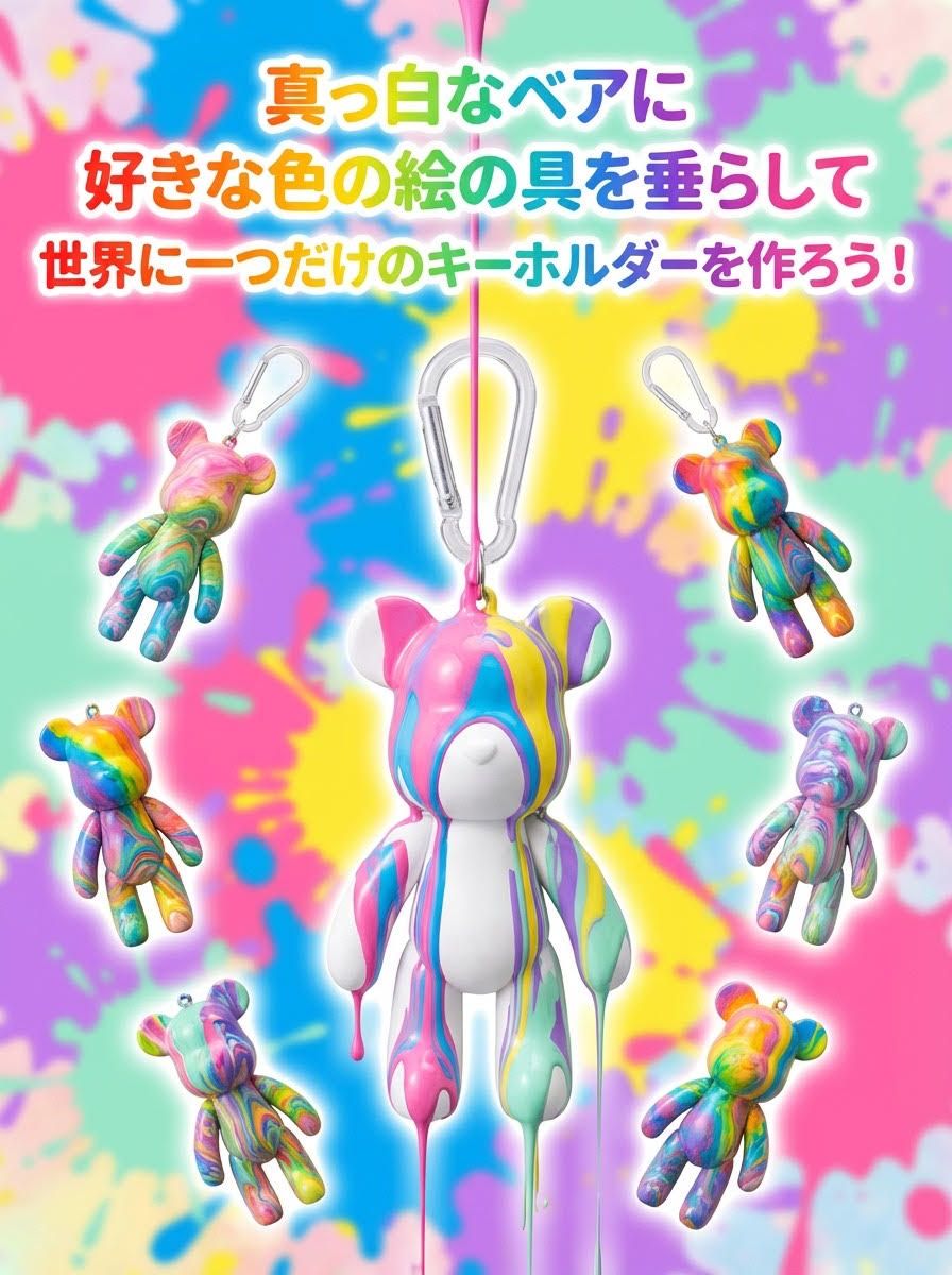 「ベアアート」とは、真っ白なベアに好きな色の絵の具を垂らして、世界に一つだけのキーホルダーを作ろう!という大注目の体験イベント。