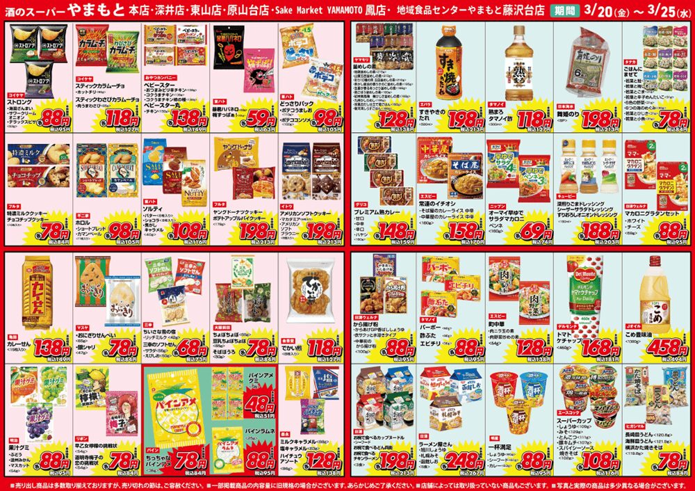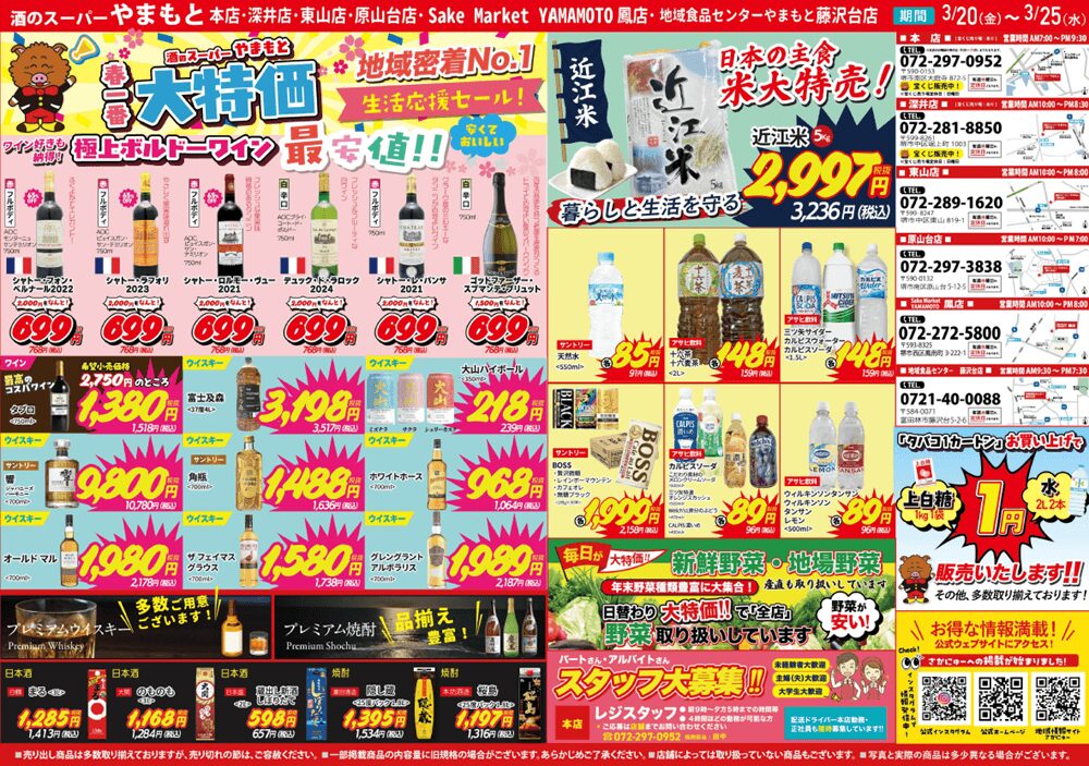 このお得なセールは3月25日(水)まで!お近くの『酒のスーパーやまもと』各店舗へぜひ足を運んでみてください。全店で新鮮野菜・地場野菜も日替わり大特価で販売中です!