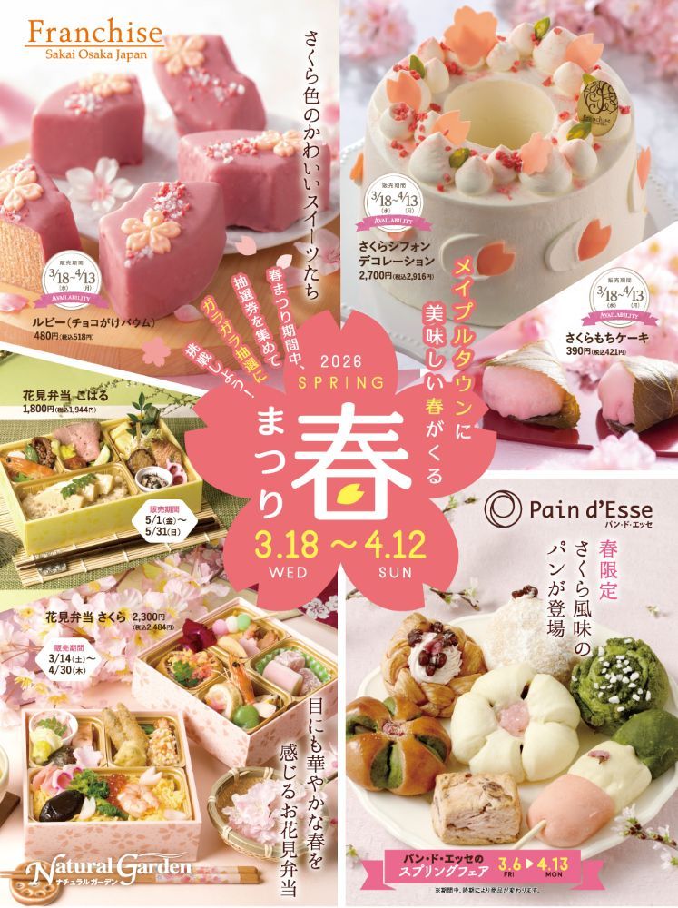 桜の季節に合わせて、堺市中区・メイプルタウン各店に春限定グルメ・スイーツ・パンが勢ぞろいします。