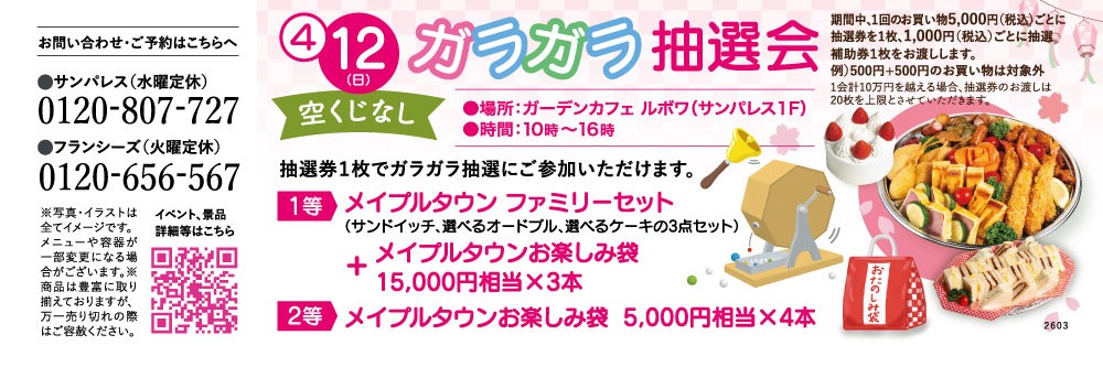 [お問い合わせ・ご予約] 2026春まつりのお問い合わせ・ご予約はこちらへ→ ●サンパレス(水曜定休) 0120-807-727 ●フランシーズ(火曜定休) 0120-656-567