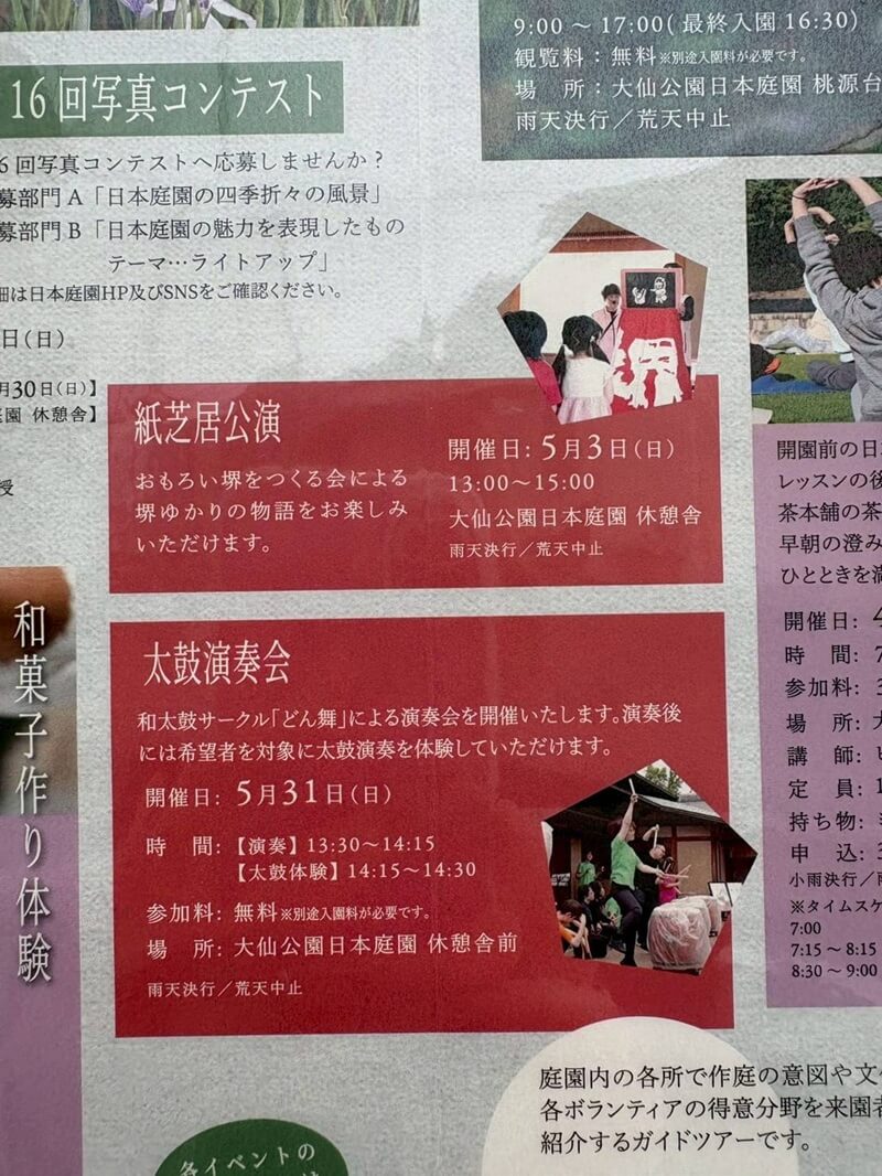 5/3(日)、大仙公園日本庭園の休憩舎にて紙芝居公演が行われるそうです!(^^)